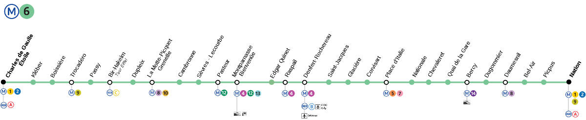 Die Linie 6 des Pariser U-Bahn-Netzes verbindet die Haltestelle Charles de Gaulle Etoile im Westen der Stadt mit der Haltestelle Nation und durchquert dabei die Stadtteile Vaugirard und Montparnasse auf der linken Seine-Seite. Die Linie hat die Besonderheit, zur Hälfte oberirdisch zu verlaufen. Deshalb bietet Ihnen die Linie 6 einen atemberaubenden Blick auf Paris und vor allem auf den Eiffelturm, wenn man zwischen den Haltestellen Passy und Bir-Hakeim über die Seine fährt. Entdecken Sie eine der längsten U-Bahn-Linien in Paris.