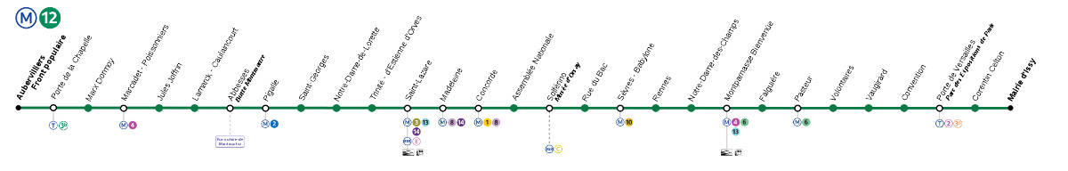 La línea 12 del metro de París es de las más largas de la red. Su recorrido de 15 kilómetros comunica la capital de norte a sur pasando por el barrio de Saint Germain-des-Prés. Fue una de las primeras líneas de la red en comunicar con la periferia parisina. Se prolongó varias veces y en la actualidad cuenta con 29 estaciones repartidas por la capital.