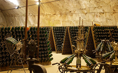 Penetre na gruta dos champanhes com etiqueta dourada. Você descobrirá as engrenagens da preparação das garrafas "Cave Privée".